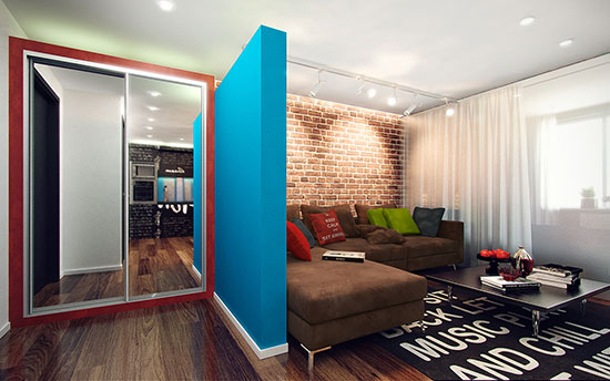 穿過藍色的隔斷墻,咱們來到雙面大鏡子前,看到鏡子里呈現的是室內空間的鏡像,但咱們看不到的是藏在它背面的隱秘。其實,這是一個衣柜。四周赤色邊框,跟藍色的隔斷墻在顏色上有個對比和杰出。鏡子是移門,它的存在把空間直接放大一倍。說這是小戶型?但看上去一點也不小。