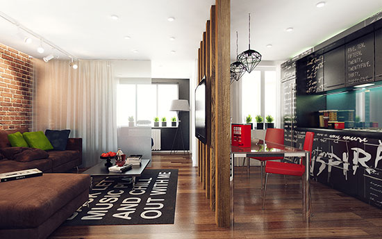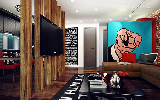 年輕人總是充溢使不完的奮發向上,當他們跟家居相遇的時候,大開的腦洞就像水庫開閘奔騰不止。一切你覺得新潮的元素他們都能運用到家居規劃中,一些你覺得匪夷所思的東西他們也相同敢用。開放式的室內格式早已沒了新鮮感,但腦洞大開的年輕人規劃出來的開放式小戶型,必定讓你意想不到。 打開房門,一眼望去處處驚艷,亮點真實太多。先是充溢濃濃復古風情的紅磚墻,讓你的眼睛不自覺地就被它招引。沙發周圍一面造型特別的隔斷墻,大塊的天藍色布景想低沉都難,比這更抓人的是那個指著你的手指,如同在對你說“I WANT YOU”。盡管茶幾跟沙發選用的都是深色精約款,但是因為有是非地毯的烘托,一點也不會覺得煩悶。