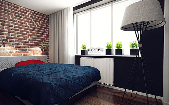 讓咱們把視野挪移挪,看到客廳里那個半透明的隔斷墻了嗎?它背面也暗藏玄機,一個臥室居然在里面。半透明間隔確保了臥室具有滿足光線,而窗簾則能更好地維護隱私。別看這間臥室不大,可說道的東西不少。客廳復古磚墻一向連續到了這兒,帶窗一面的墻居然被刷成了黑色,真是好大的膽子!赤色的枕頭,綠色的盆栽,這些顏色盡管反差挺大,但搭配起來竟十分調和。