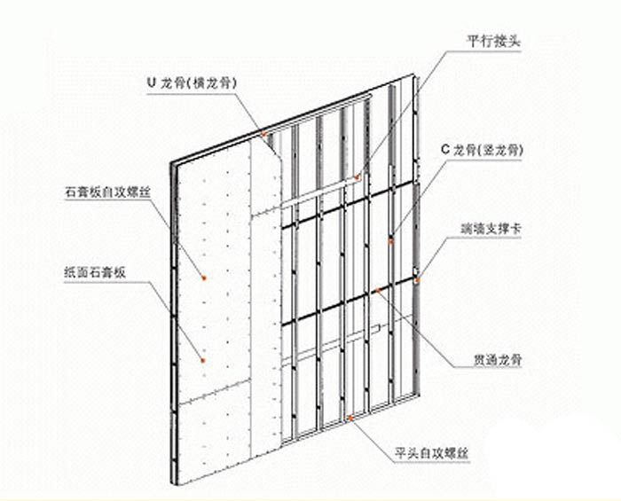 (2)龍骨兩側的石膏板及龍骨一側的內外兩層石膏板應錯縫排列,接縫不得落在同一根龍骨上。