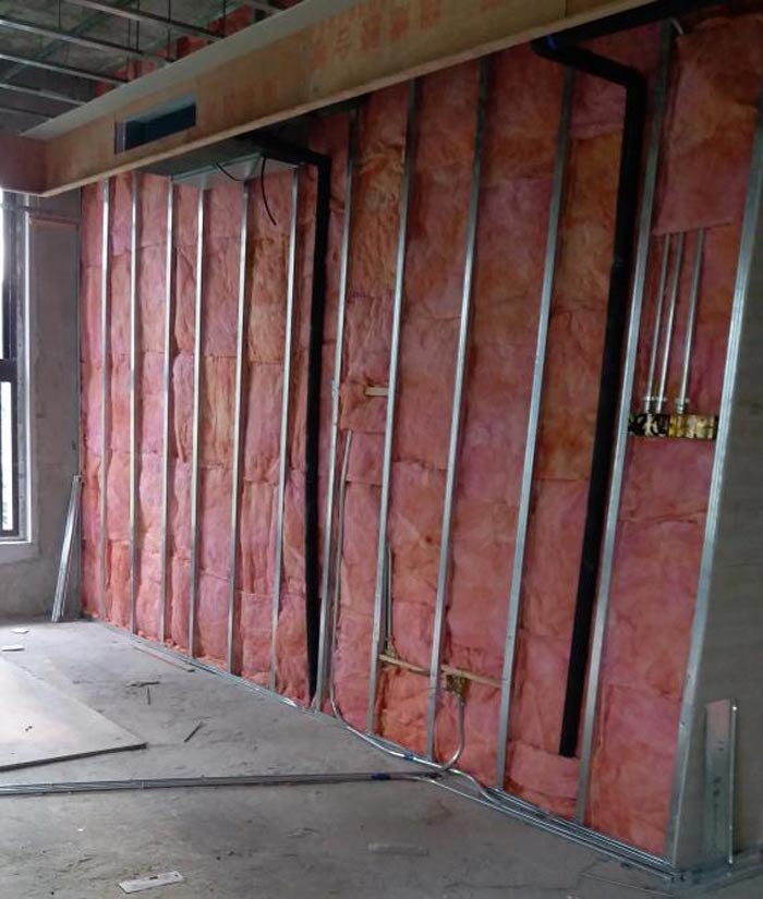 (9)鋪放墻體內的玻璃棉。礦棉板、巖棉板等填充材料,與安裝另一側紙面石膏板同時進行,填充材料應鋪滿鋪平。